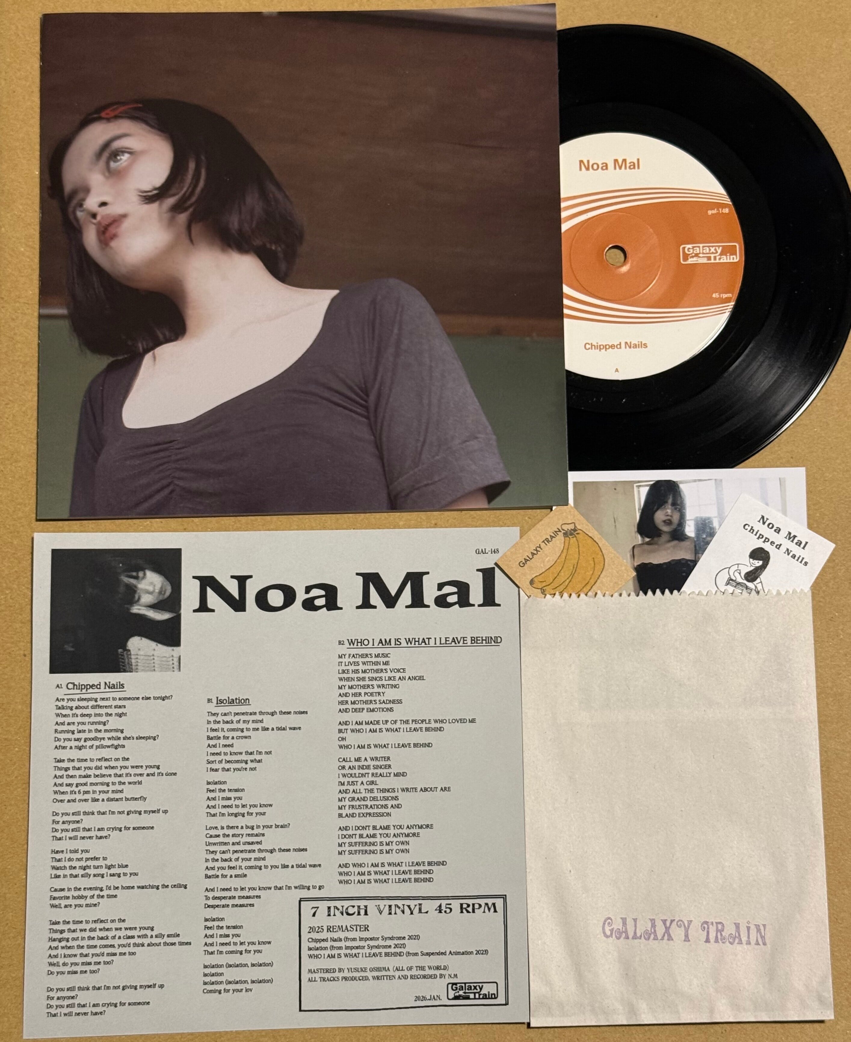 2025年の来日公演の余韻も残る中、Noa Malからのニューイヤーギフト。大人気カセットImpostor Syndromeに収録されNoa Malを代表する2曲"Chipped Nails"と"Isolation"、現時点で初フィジカル化の名曲"WHO I AM IS WHAT I LEAVE BEHIND"の3曲が7インチレコードになりました。